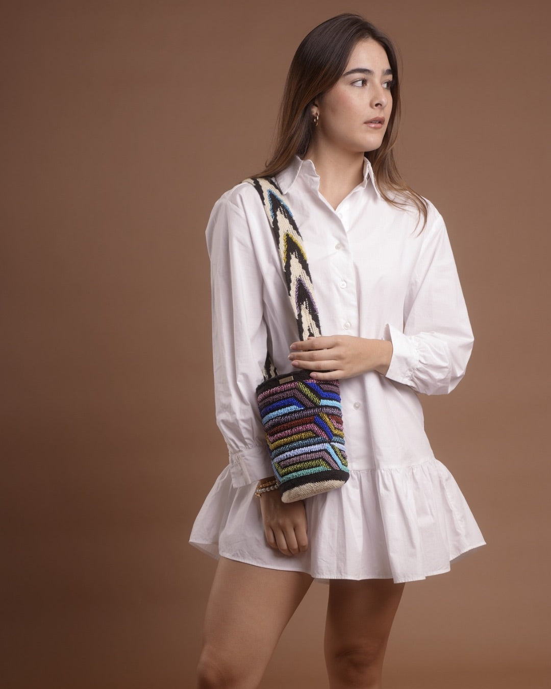 Las mochilas Arhuacas son un símbolo ancestral de la riqueza cultural de las comunidades indígenas que habitan la Sierra Nevada de Santa Marta, en Colombia. Tejidas a mano por artesanas indígenas, estas piezas están elaboradas con lana de alpaca local y adornadas con mostacillas checas que añaden un toque de brillo y color duradero.