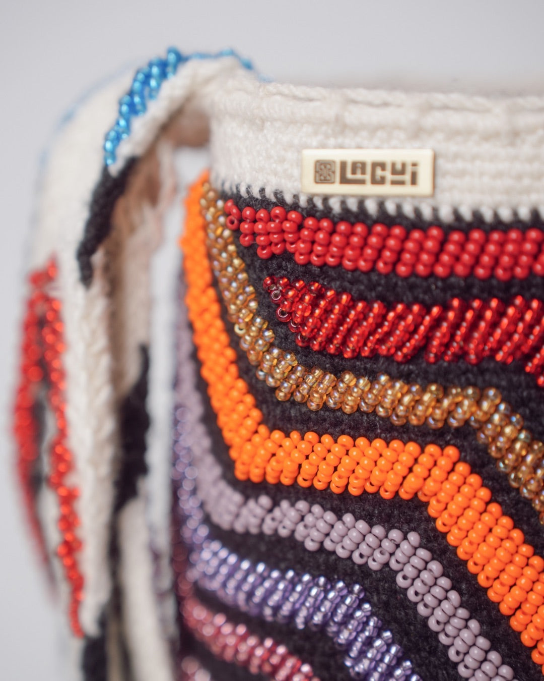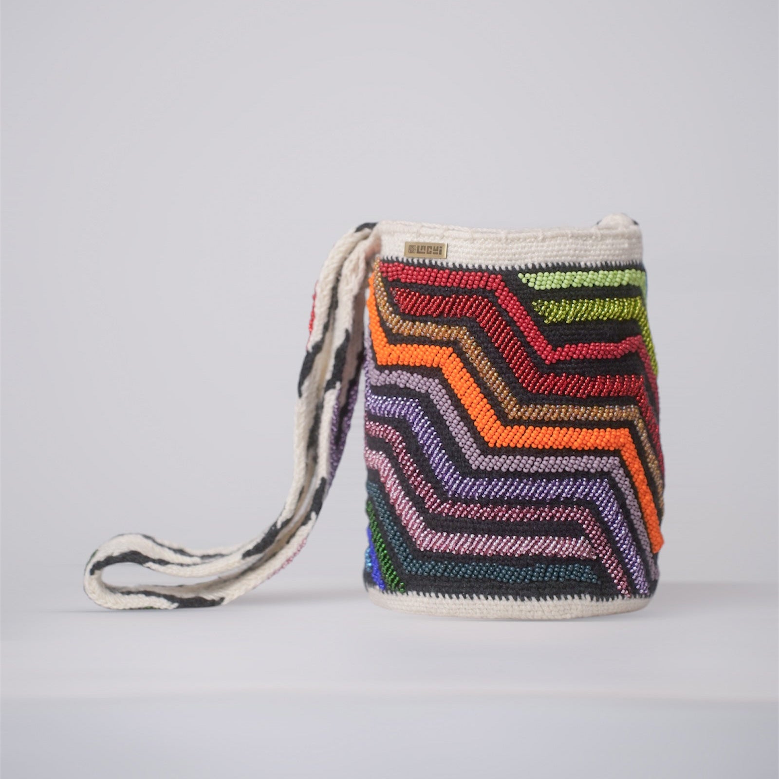 Las mochilas Arhuacas son un símbolo ancestral de la riqueza cultural de las comunidades indígenas que habitan la Sierra Nevada de Santa Marta, en Colombia. Tejidas a mano por artesanas indígenas, estas piezas están elaboradas con lana de alpaca local y adornadas con mostacillas checas que añaden un toque de brillo y color duradero.
