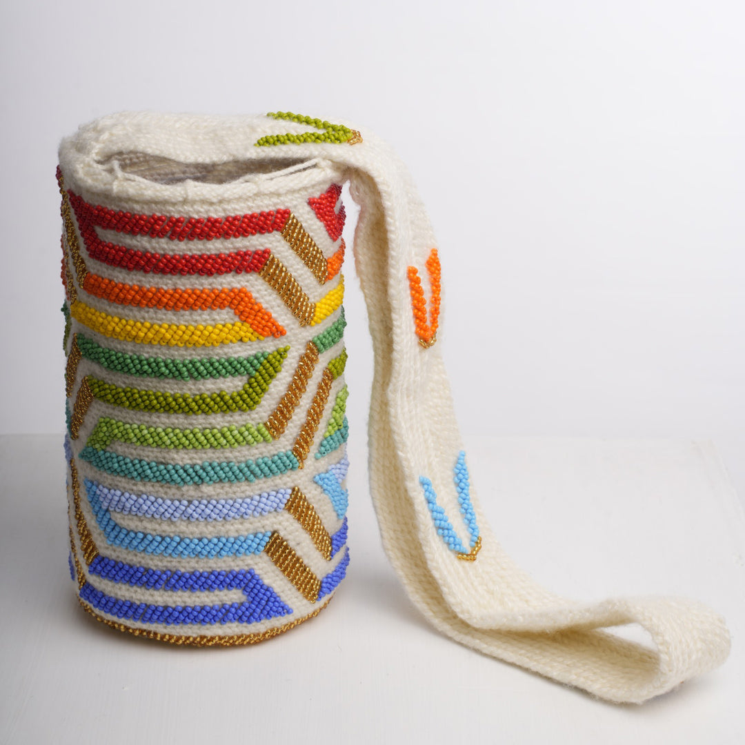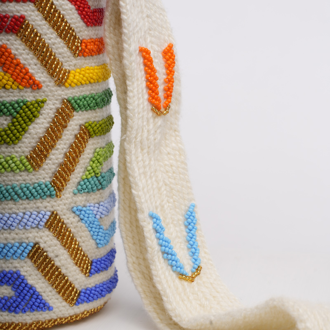 Las mochilas Arhuacas son un símbolo ancestral de la riqueza cultural de las comunidades indígenas que habitan la Sierra Nevada de Santa Marta, en Colombia. Tejidas a mano por artesanas indígenas, estas piezas están elaboradas con lana de alpaca local y adornadas con mostacillas checas que añaden un toque de brillo y color duradero.